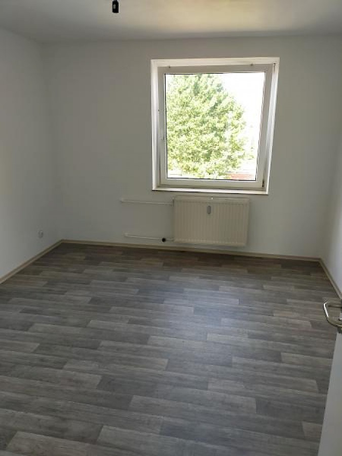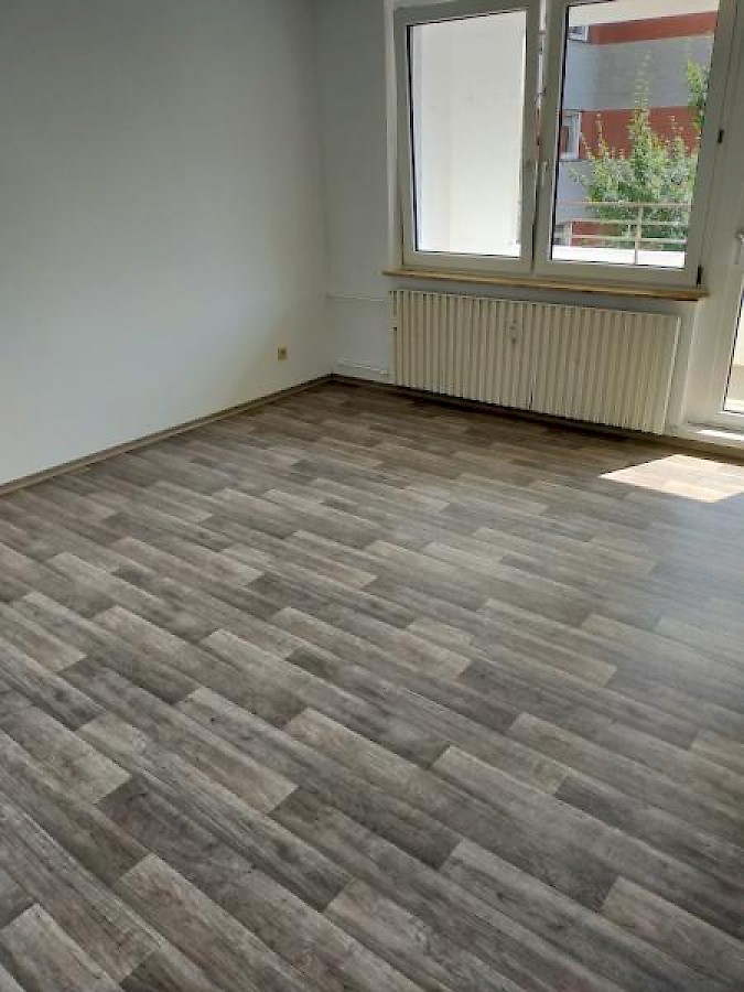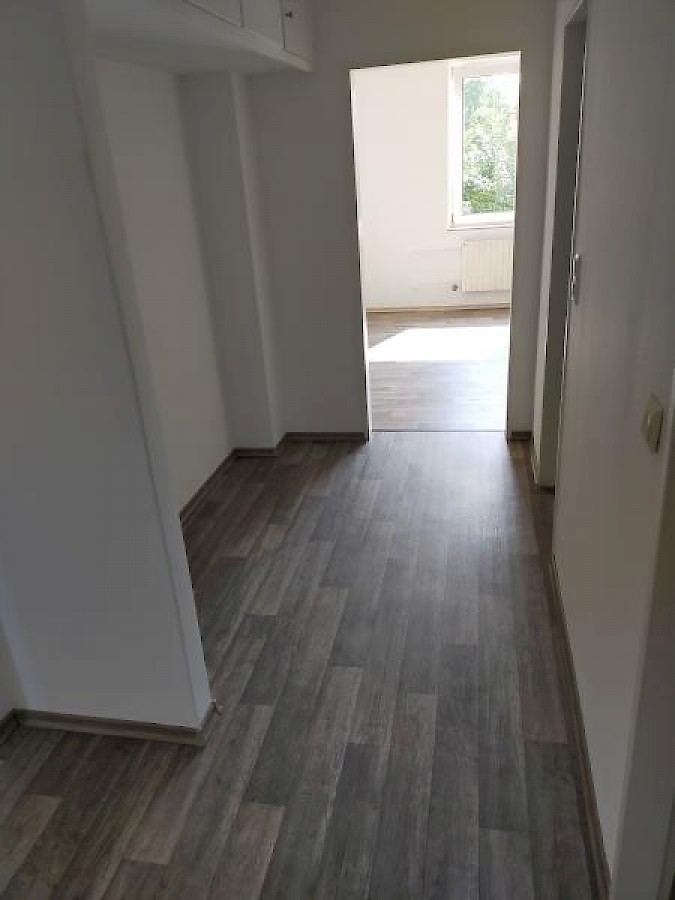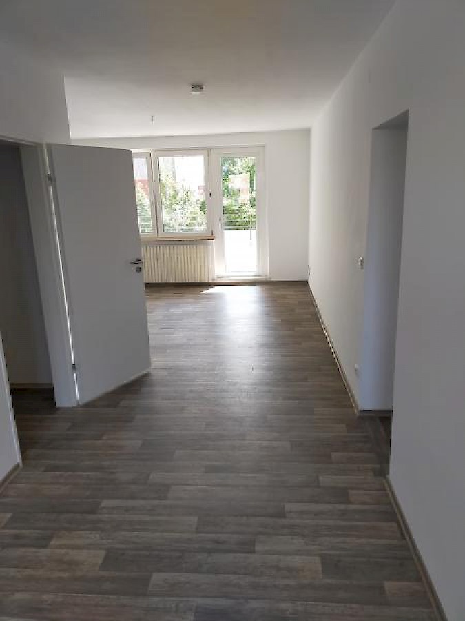 Die Wohnung ist neu renoviert, die Wände sind Raufaser Weiß, alle Böden sind in gepflegtem Laminat oder Vinyl. In Flur, Diele und im Bad sind Fliesen verlegt worden.